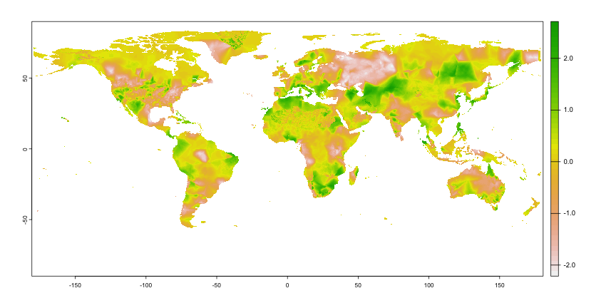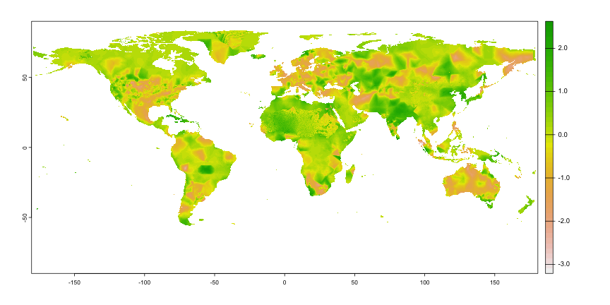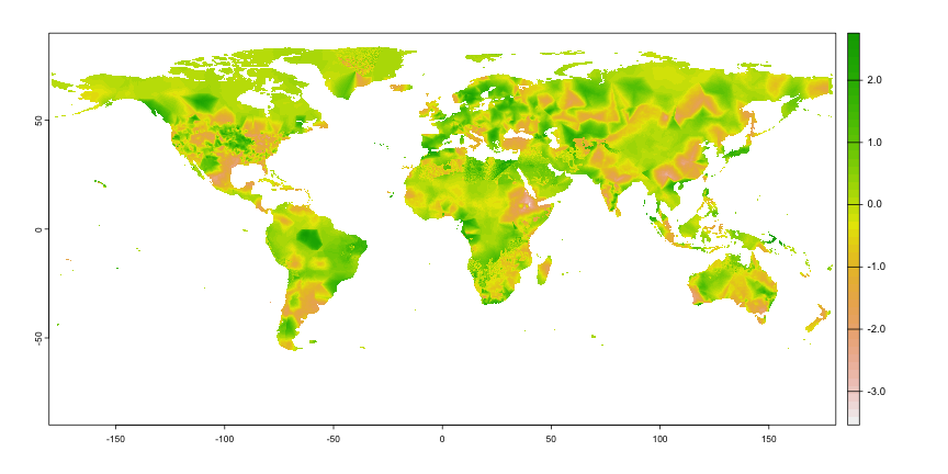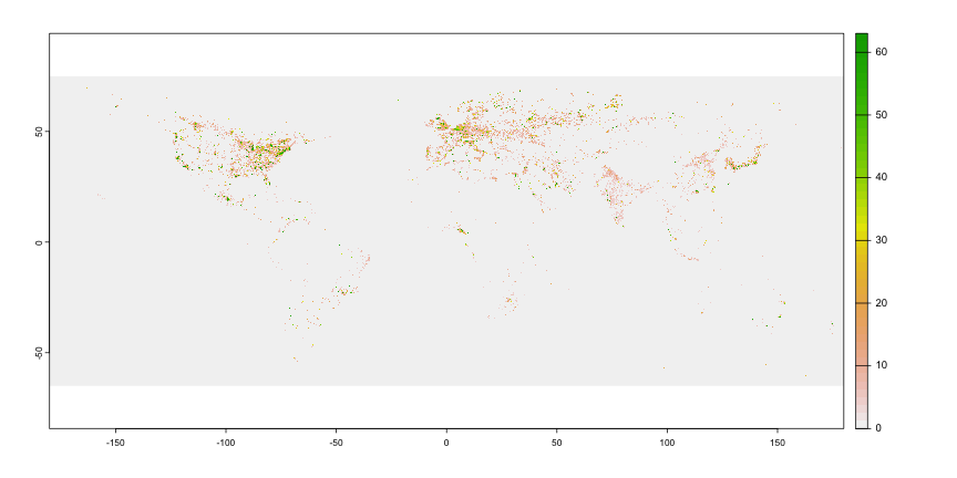 <!-- class: inverse, center, title-slide, middle --> class: center, middle <style> g { color: rgb(0,130,155) } r { color: rgb(174,77,41) } y { color: rgb(177,148,40) } </style> # Lecture 06: Geospatial Data Sciences # and Economic Spatial Models ## <img src="figs/bse_primary_logo.png" style="width: 35%" /><br><br>Bruno Conte ## 11-12/Feb/2026 --- # Geospatial Data and Spatial Models: Schedule 1. ~~Introduction to (spatial) data and programming in `R`~~ **[08/Jan/2026]** 2. ~~Week 2-4: Vector spatial data~~ **[14 - 29/Jan/2026]** 3. Week 5-7: Raster spatial data + (basic) interactive tools **[05 - 19/Feb/2026]** - ~~Week 5: Raster basics and unary operations using `sf` and `terra`~~ - Week 6: Vector-raster operations - Week 7: Interactive tools with `leaflet` and APIs 4. Week 8-10: Spatial models and applications with data **[25/Feb - 12 Mar/2026]**<br> <br> 5. <span style="color: rgb(177,148,40)">Take-home exam</span> **[27/Mar/2026]** --- # Main references for this class 1. Lovelace, R., Nowosad, J. and Muenchow, J., 2019. <g>**Geocomputation with R.**</g> Chapman and Hall/CRC. - Chapters 2.3, 3.3, 4.3, 5.3, and 6 2. Pebesma, E., 2018. Simple Features for R: Standardized Support for Spatial Vector Data. The R Journal 10 (1), 439-446 3. Wickham, H. and Grolemund, G., 2016. R for data science: import, tidy, transform, visualize, and model data. " O'Reilly Media, Inc.". --- # Raster basics: loading, creating, and operations with rasters .pull-left[ - ~~Creating and~~ **loading rasters** with `terra` (external files) - ~~<r>Unary</r> operations:~~ - ~~Cropping~~ - ~~Vectorization~~ ] .pull-right[ - <g>Vector-raster</g> operations: - Data extraction - Zonal statistics - Rasterize - Distances over networks using rasters ] -- Requires **additional libraries** on top of `sf` 1. `terra`: contains most of the <r>**raster-related functions**</r> 2. `exactextractr`: performs high-performance <y>zonal statistics</y> 3. `gdistance`: used to calculate <g>distances over raster</g> --- # Raster basics: loading rasters - Loading rasters with `terra::rast()` - <g>**Most used format:**</g> `.tif` (nightlight example [<u>here</u>](https://www.dropbox.com/scl/fi/yu7b30oxiypy8q7o8312d/F101992.v4b_web.stable_lights.avg_vis.tif?rlkey=ysegpnnns8oz8khnykhc1ebkz&dl=1)) - Multilayer format: NetCDF `*.nc` (drought example [<u>here</u>](https://www.dropbox.com/scl/fi/kmo2gj0iqvu52rat9ydmt/spei01.nc?rlkey=1ahg7k4cs1uf1v52s5x6d0sxj&dl=1)) -- ```r library(terra) r.nlights <- rast('../../Research/Data/gis data/NL NOAA Version 4 DMSP-OLS/F101992.v4/F101992.v4b_web.stable_lights.avg_vis.tif') *r.nlights ``` ``` ## class : SpatRaster ## dimensions : 16801, 43201, 1 (nrow, ncol, nlyr) ## resolution : 0.008333333, 0.008333333 (x, y) ## extent : -180.0042, 180.0042, -65.00417, 75.00417 (xmin, xmax, ymin, ymax) ## coord. ref. : lon/lat WGS 84 (EPSG:4326) ## source : F101992.v4b_web.stable_lights.avg_vis.tif ## name : F101992.v4b_web.stable_lights.avg_vis ## min value : 0 ## max value : 63 ``` --- # Raster basics: loading rasters ```r *plot(r.nlights) ``` <!-- --> --- # Raster basics: loading rasters - Loading rasters with `terra::rast()` - Most used format: `.tif` (nightlight example [<u>here</u>](https://www.dropbox.com/scl/fi/yu7b30oxiypy8q7o8312d/F101992.v4b_web.stable_lights.avg_vis.tif?rlkey=ysegpnnns8oz8khnykhc1ebkz&dl=1)) - <g>**Multilayer format:**</g> NetCDF `*.nc` (drought example [<u>here</u>](https://www.dropbox.com/scl/fi/kmo2gj0iqvu52rat9ydmt/spei01.nc?rlkey=1ahg7k4cs1uf1v52s5x6d0sxj&dl=1)) ```r library(terra) r.spei <- rast('../../Research/Data/gis data/spei/spei01.nc') *r.spei ``` ``` ## class : SpatRaster ## dimensions : 360, 720, 1380 (nrow, ncol, nlyr) ## resolution : 0.5, 0.5 (x, y) ## extent : -180, 180, -90, 90 (xmin, xmax, ymin, ymax) ## coord. ref. : lon/lat WGS 84 ## source : spei01.nc ## varname : spei (Standardized Precipitation-Evapotranspiration Index) ## names : spei_1, spei_2, spei_3, spei_4, spei_5, spei_6, ... ## unit : z-values, z-values, z-values, z-values, z-values, z-values, ... ## time : 1901-01-16 to 2015-12-16 ``` --- # Raster basics: loading rasters ```r *plot(r.spei[[1]]) # note the [[x]]!! ``` <!-- --> --- # Raster basics: loading rasters ```r *plot(r.spei[[10]]) # note the [[x]]!! ``` <!-- --> --- # Raster basics: loading rasters ```r *plot(r.spei[[15]]) # note the [[x]]!! ``` <!-- --> --- # Raster basics: loading rasters ```r *plot(r.spei[[20]]) # note the [[x]]!! ``` <!-- --> --- # Raster-vector operations: data extraction .pull-left[ - Vector-raster <g>**data extraction**</g>: - Extracts values where vector vertices overlay the raster with `extract` - Interaction between `sf` and `terra` objects - <r>**Required standardization:**</r> from `sf` vector into `SpatVec()` ] .pull-right[ <img src="https://tmieno2.github.io/R-as-GIS-for-Economists/R_GIS_Book_files/figure-html/illustrate-points-1.png" style="width: 100%" /> ] --- # Raster-vector operations: data extraction .pull-left[ - Vector-raster <g>**data extraction**</g>: - Extracts values where vector vertices overlay the raster with `extract` - Interaction between `sf` and `terra` objects - <r>**Required standardization:**</r> from `sf` vector into `SpatVec()` - Polygon extraction retrieves <y>multiple values</y> (one for each vertex) ] .pull-right[ <img src="https://tmieno2.github.io/R-as-GIS-for-Economists/R_GIS_Book_files/figure-html/polygons-extact-viz-1.png" style="width: 100%" /> ] --- # Raster-vector operations: zonal statistics .pull-left[ - Vector-raster <g>**zonal statistics**</g>: - <r>Calculates statistics</r> (e.g., average) of the overlaying raster values within a ploygon - Potentially CPU-demanding: efficient `exactextractr::exact_extract` - Allows for <y>multiple statistics</y> - Deals with <g>multi-layer rasters</g> ] .pull-right[ <img src="https://tmieno2.github.io/R-as-GIS-for-Economists/R_GIS_Book_files/figure-html/polygons-extact-viz-1.png" style="width: 100%" /> ] --- # Raster-vector operations: zonal statisti